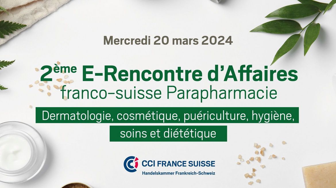 Forte du succès de la 1ère Rencontre d'Affaires dédiée à la Parapharmacie, qui a permis l'organisation de plus de 130 rendez-vous d'affaires, la CCI France Suisse a décidé de renouveler l'opération en ligne le mercredi 20 mars 2024.