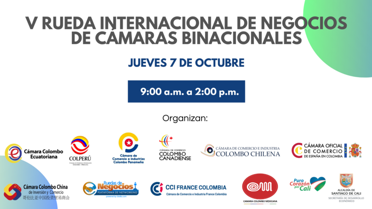 Les Chambres binationales du Brésil, Canada, Chili, Chine, Équateur, Espagne, France, Mexique, Panama et Pérou, présentes en Colombie, en partenariat avec la Mairie de Santiago de Cali, vous donnent rendez-vous le jeudi 7 octobre de 9 h à 14 h (fuseau horaire Colombie ; +7 heures pour la France).
