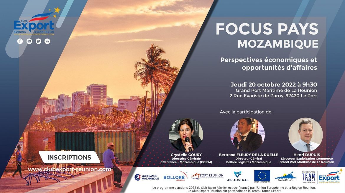 Le Club Export Réunion organise en partenariat avec la CCIF Mozambique un Focus Pays sur le Mozambique au Grand Port Maritime de La Réunion le jeudi 20 octobre 2022 à 9h30 sur le thème :
