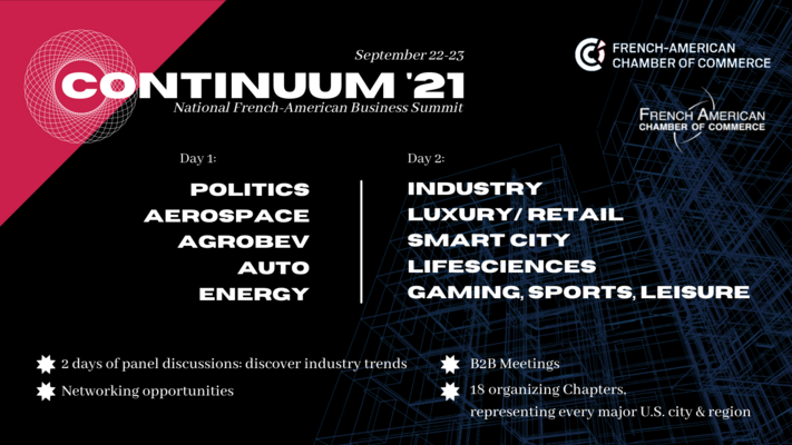 De l'énergie à l'agroalimentaire, en passant par la politique, la vente au détail, l'aérospatiale et bien plus encore, Continuum '21 est le lieu de rencontre des professionnels transatlantiques pour une vue d'ensemble du marché américain.