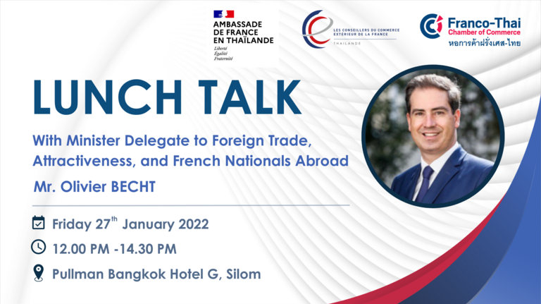 Une belle opportunité pour la communauté d'affaires franco-thaïlandaise de rencontrer Olivier BECHT, ministre délégué auprès de la ministre de l'Europe et des Affaires étrangères chargé du Commerce extérieur, de l'Attractivité et des Français de l'étranger.