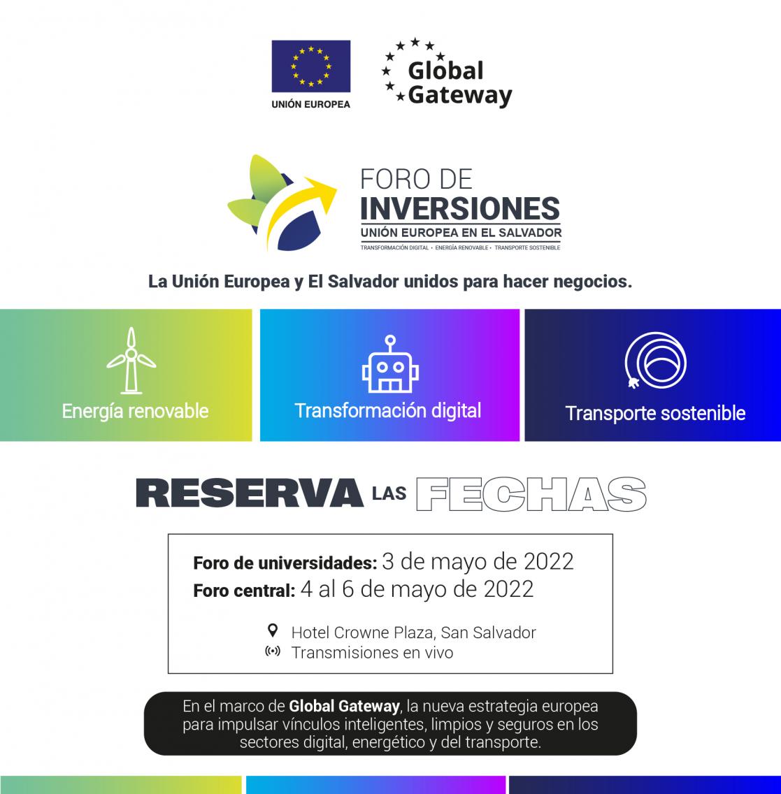 Un forum d‘investissements organisé par la Délégation de l'Union Européenne à El Salvador, dans le but de créer un point de rencontre entre les investisseurs européens, les hommes d'affaires et les institutions publiques pour développer des projets dans trois secteurs stratégiques prioritaires pour El Salvador :