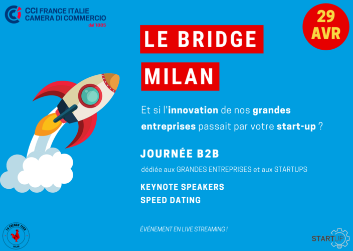 La CCI France Italie organise la deuxième édition du Bridge le 29 avril à 14h00. Une journée B2B dédiée aux startups intéressées au business et à l'open innovation et aux grandes entreprises (Responsables Innovation, Responsables Marketing, Finance, Achats, etc...), sur le format du speed dating. L'objectif est de générer du business et offrir des partenariats mutuellement bénéfiques