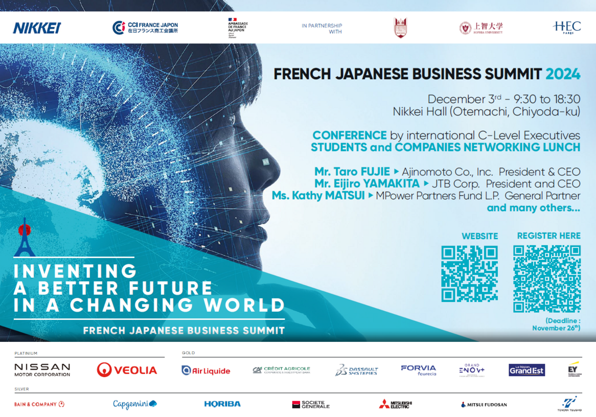 La CCIF Japon, ainsi que l'Ambassade de France, organise le "French Japanese Business Summit", le 3 décembre au Nikkei Hall à Tokyo.