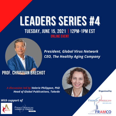 La CCI France Boston en partenariat avec la CCI France Tampa (FRAMCO), organise son quatrième événement de la série"Leaders". Une conversation avec le professeur Christian BRECHOT, président de la CCI France Tampa, ancien président/directeur général de l'INSERM, président du Global Virus Network et CEO de la Healthy Aging Company. L'évènement sera animée par Valérie PHILIPPON, phd, cofondatrice du forum FABS de la CCIF Boston et responsable des publications mondiales chez Takeda.