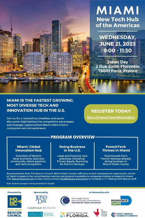 Lors de cet évènement en partenariat avec la CCI France USA à Miami, le 21 juin 2023, vous pourrez découvrir l'écosystème technologique florissant et diversifié de Miami, ainsi que les avantages concurrentiels dont bénéficient les startups et les entreprises françaises en plein essor.