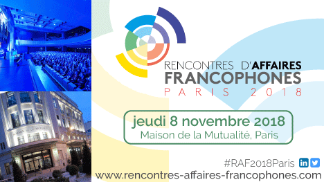 Le jeudi 8 novembre 2018 à la Maison de la Mutualité à Paris, participez aux Rencontres d'Affaires Francophones 2018, un événement multi-secteurs d'activités. Cette journée de conférences, tables rondes et rencontres B2B au Village d’Affaires Francophones vous aidera à booster vos affaires à l'international, et particulièrement vers la francophonie.
