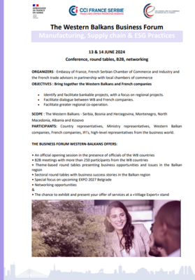 La CCIF Serbie, en collaboration avec l’Ambassade de France et les Conseillers de Commerce Extérieur, organise les 13 et 14 juin prochain le forum " Western Balkans Business Forum : Manufacturing, Supply chain & ESG Practices". Franck RIESTER, ministre délégué chargé du Commerce extérieur, de l’Attractivité, de la Francophonie et des Français de l’étranger a d'ores et déjà confirmer sa présence.