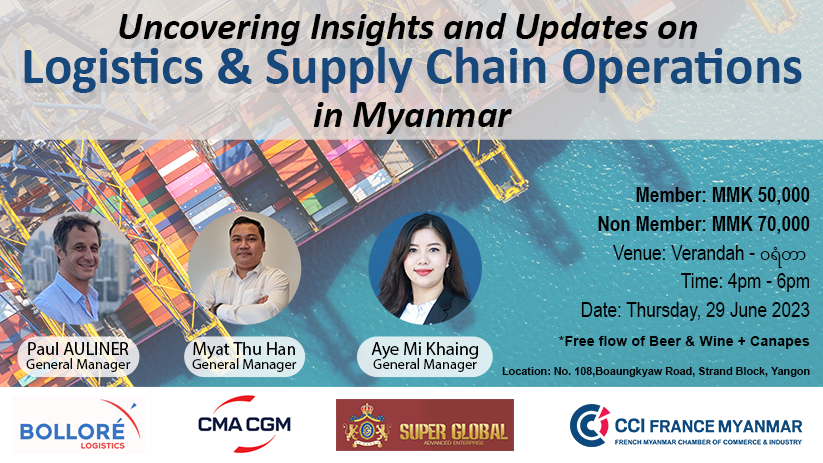 Rejoignez la CCI France Birmanie à la table ronde sur la chaîne d'approvisionnement et la logistique, "Découvrir les idées et les mises à jour sur les opérations de logistique et de chaîne d'approvisionnement en Birmanie", le 29 juin 2023.