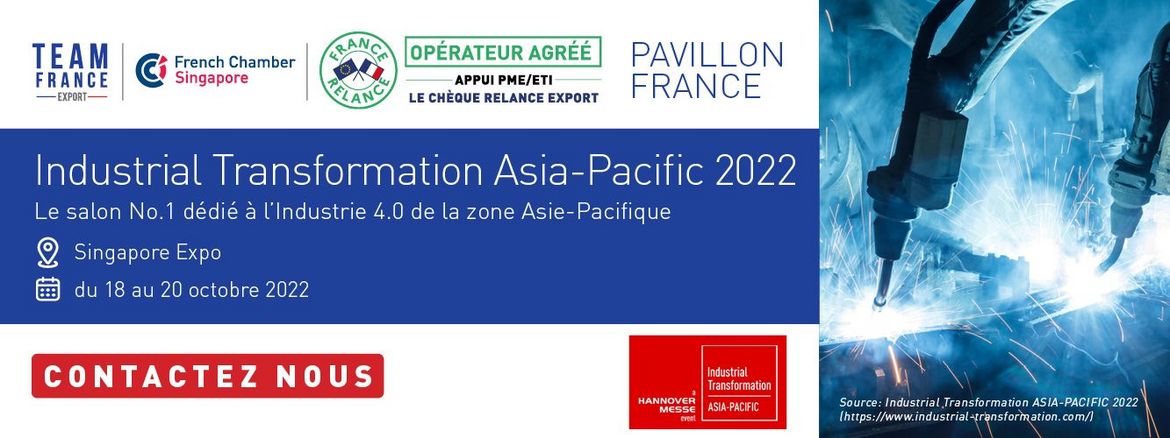 La CCI France Singapour organise un Pavillon France au salon Industrial Transformation Asia Pacific 2022. Cet évènement est le rendez-vous des professionnels des industries transformatives 4.0 en Asie et a lieu à Singapour, au centre des expositions Singapore EXPO.