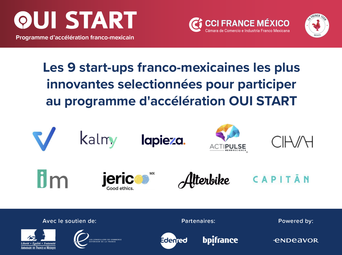 Oui Start est un programme développé par la CCI France Mexique, la French-Tech México et Endeavor, avec l’appui financier des sponsors Bpifrance et Edenred, ainsi que le soutien institutionnel de l’Ambassade de France au Mexique et des Conseillers du Commerce Extérieur de la France.