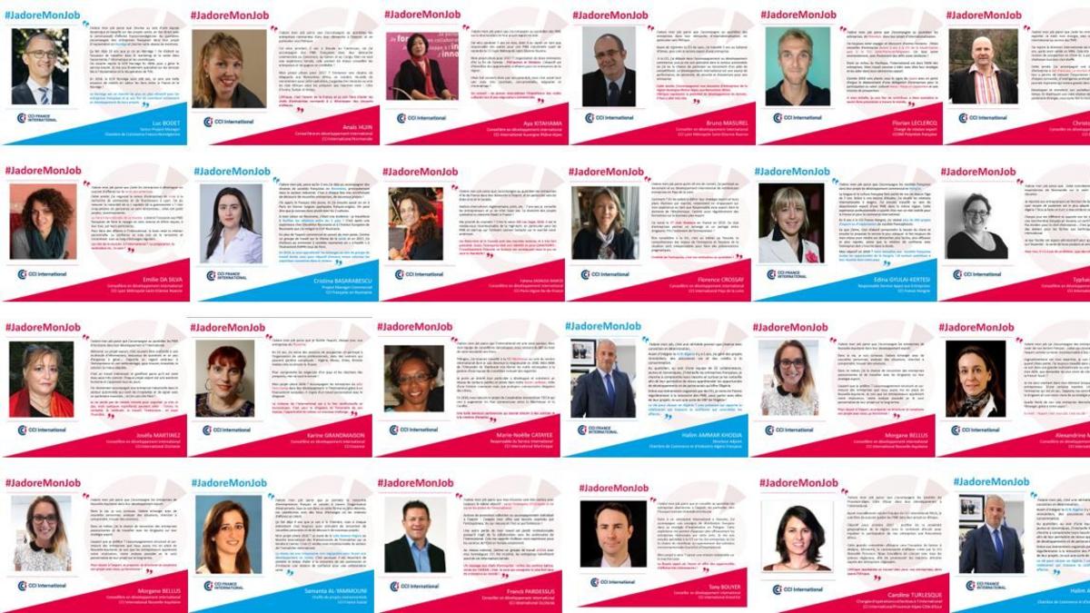 A l'occasion de la campagne #JadoreMonJob, menée entre juin 2017 et février 2018, nous avons mis à l'honneur les collaborateurs CCI - CCI FI, aussi bien en France qu’à l’étranger, en publiant leur portrait sur les réseaux sociaux : Twitter et LinkedIn.