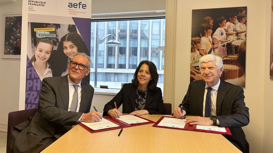 Claudia SCHERER-EFFOSSE, Directrice Générale de l’Agence pour l'enseignement français à l'étranger (AEFE), Arnaud VAISSIÉ, Président de CCI France International et Ahmed MERNISSI, Président de l'Union des anciens des lycées français du monde (Union-ALFM) ont signé ce jeudi 13 février une convention tripartite visant à renforcer les liens entre les élèves des lycées français à l'étranger, les alumni des lycées français du monde et le monde professionnel.