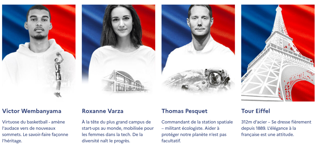 Plusieurs "égéries", des personnalités françaises issues de divers environnements (sport, business, gastronomie, aérospatial...), ont accepté d'incarner la campagne :