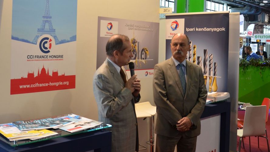 L’inauguration du Pavillon « France » s’est faite en présence et avec les mots de bienvenue de S.E.M. Éric Fournier, Ambassadeur de France en Hongrie et M. Miklós Maróthy, Président de la CCI France Hongrie. La délégation de l’Ambassade et la direction de la CCI France Hongrie ont rendu visite à chacun des exposants français sur notre stand ainsi qu’aux entreprises françaises qui ont exposé individuellement : Schneider Electric Zrt., NP Hungaria Kft., Saint-Gobain Construction Products Hungary Kft. et Trilogiq Kft. Les membres de cette communauté d’affaires ont ensuite eu l’occasion d’échanger autour d’un verre de champagne et de quiches, offerts par Total.