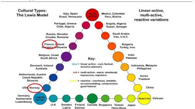 Les français sont considérés comme « linéaires » et vont directement aux conclusions finales tandis que les norvégiens communiqueront très probablement de manière « multi-active », en essayant de trouver d’autres alternatives à un problème.