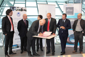 M. Gérard Pignatel, Président de la Chambre de Commerce Franco-Norvégienne et M.Pascal Lecamp, Directeur de la Mission Economique Ubifrance Norvège ont signé le 16 janvier 2012, une convention fixant le cadre de leur collaboration pour le service d’accompagnement des entreprises françaises en Norvège.