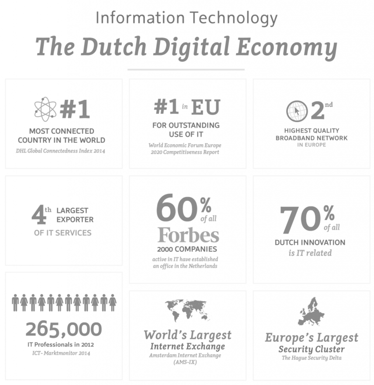 Cisco, Google, Microsoft, Equinix, Apple, Oracle, IBM, Huawei, Asus, Hitachi, Verizon, HP et plus, ont une part de leurs activités aux Pays-Bas. Cela comprend des centres de données, des centres de recherche ou encore leur siège social européen. Ce développement est permis par non seulement une infrastructure de haute qualité, mais aussi grâce à une population qualifiée qui, de plus, en très grande majorité maîtrise l’anglais.