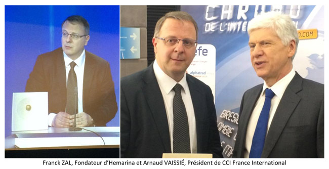 Arnaud VAISSIÉ, Président de CCI France International a remis ce mardi 17 janvier, le 2nd Trophée CCI France International à Franck ZAL, Fondateur, Directeur Général et Directeur Scientifique de la société Hemarina, à l’occasion du lancement de l’édition 2017 des « 24h Chrono de l’international », évènement organisé par Mondissimo avec le soutien de TV5 Monde. Cette remise de trophée a eu lieu en présence de Matthias FEKL, Secrétaire d’État chargé du Commerce extérieur, de la promotion du tourisme et des Français de l’étranger.